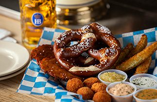 A German favorite served at the Oktoberfest and the Hofbräuhaus am Platzl. Great for sharing! Giant pretzel served with “Obatzda” Cheese, Sweet Bavarian Mustard and our Signature Hausmade Bier Cheese