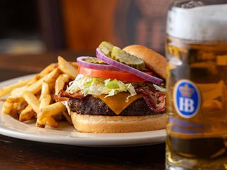 Grilled and topped with our Hausmade Dunkel Bourbon Glaze, Swiss Cheese and Smoked Bacon, served with Lettuce, Tomato, Red Onion and Pickles on a Brioche Bun